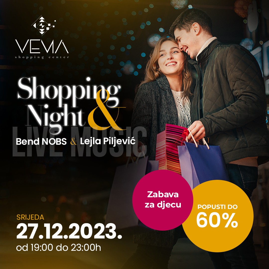 Decembar je mjesec druženja, zabave, poklona ali i povoljne kupovine. Upravo vas odlična atmosfera i nevjerovatni popusti očekuje ove srijede u Vema Shopping Centru u Visokom. Od 19:00 do 23:00 sata uživajte s porodicom ili prijateljima u fantastičnoj atmosferi uz live muziku Lejle Piljević i benda NOBS i iskoristite izvrsnu priliku za lijepo druženje, odličan shopping, ali i osvajanje vrhunskih nagrada. U Shopping Night-u će uživati i najmlađi posjetioci uz face painting, modeliranje balona i vesele maskote.