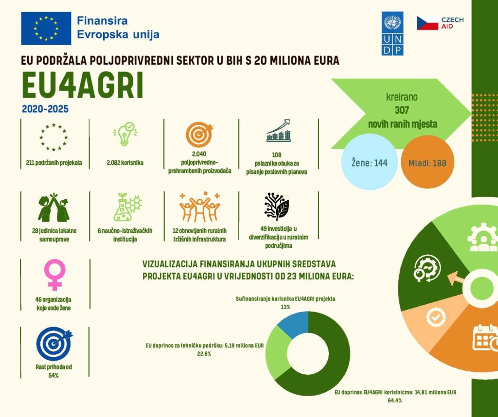 Tokom pet godina implementacije, od 2020. do 2025. godine, kroz EU-finansirani projekat EU4AGRI, uloženo je 20 miliona eura. Projekat je pružio podršku za 2.040 aktera u agro-prehrambenom sektoru, uključujući više od 1.600 malih poljoprivrednih gazdinstava, te omogućio otvaranje 307 novih radnih mjesta, od kojih je više od polovine namijenjeno ženama i mladima. Projekat je implementirao Razvojni program Ujedinjenih nacija (UNDP) u BiH, u partnerstvu sa Češkom razvojnom agencijom (CzDA).