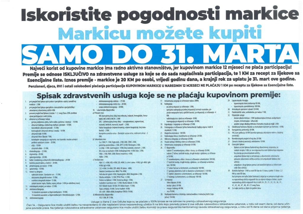 Iznos premije-markice je 20 KM po osobi i vrijedi godinu dana, a krajnji rok za uplatu je 31. mart 2023.godine.
