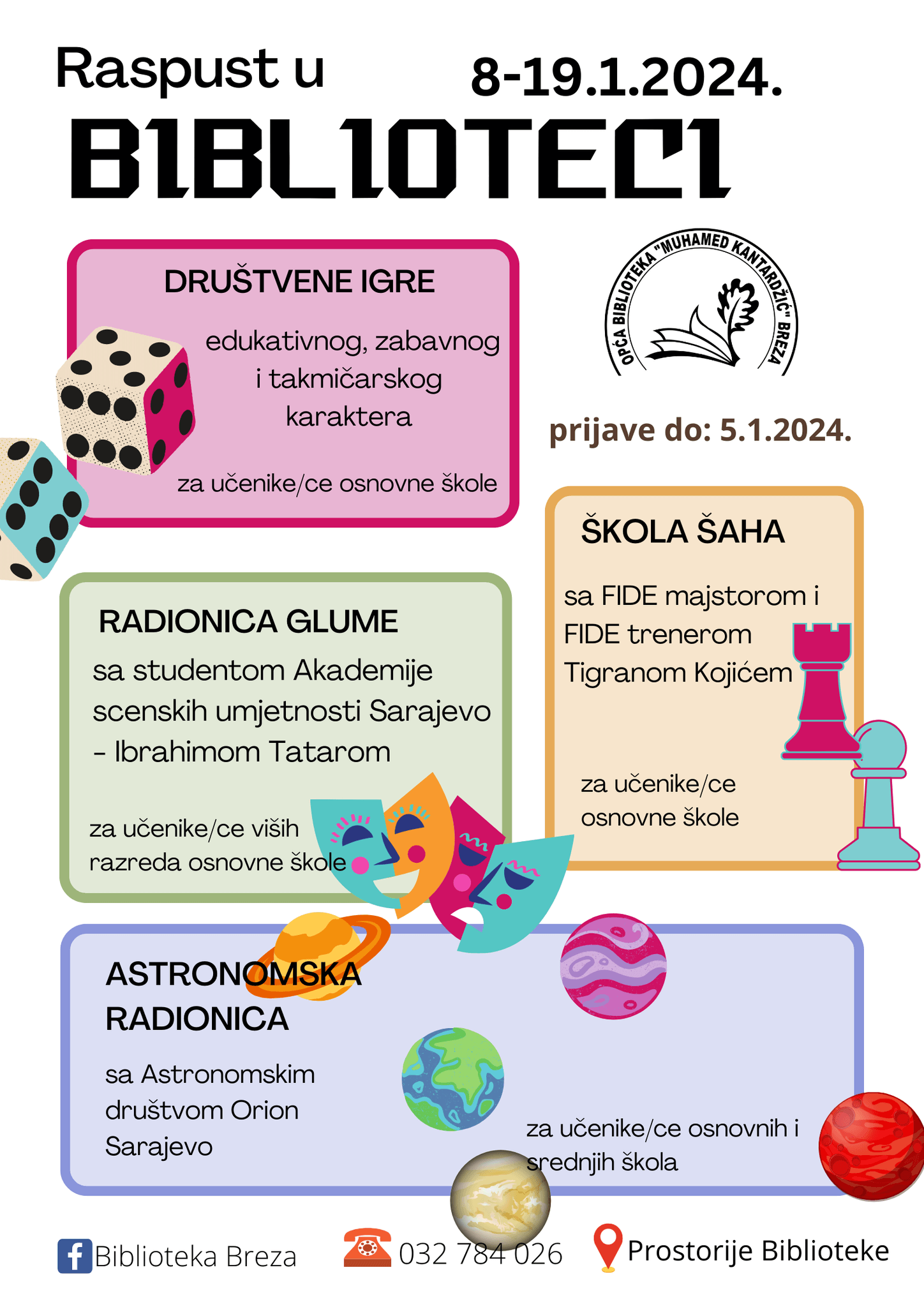 Prijave za učešće u radionicama otvorene su do 5. januara, a prijaviti se možete u prostorijama Biblioteke, telefonom na broj 032 784 026 ili putem facebook stranice Opće biblioteke “Muhamed Kantardžić” Breza.